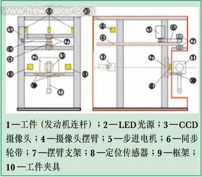检测装置为一台式仪器,结构很紧凑。从图3的两个示意图可看出,摄像头3固定在摆臂4的一端,其另一端通过枢轴支承在支架7上。安装在机架9一侧的步进电机5,借助同步齿形带6和枢轴上的同步轮可带动摆臂4回转,转动的范围为±150,由布置在机架两侧的二个接近传感器8辅助定位。另外一对光电传感器安放在工件1的入口处两侧,用于确保实施测量前工件在夹具上的准确定位,并接通光源。