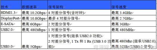 以 HDMI1.3和DisplayPort为例,HDMI1.3一般是指在340Mpixel/s下按最高10Gbps的数据传输速度工作,这里的最高传输速度表示接口将根据所连接的发生器和接收器的视频能力而改变其时钟速率。被连接的两种设备的分辨率或颜色深度越高,时钟频率就越高。比如,高清视频在 1,080p模式下就比在1,080i模式下要处理的数据信息多,时钟速率也更快。实际工作时,HDMI的工作速度取决于发射器和接收器的能力以及播放源的分辨率和颜色深度。图1所示为常用高速接口的TMDS的最高工作速率。