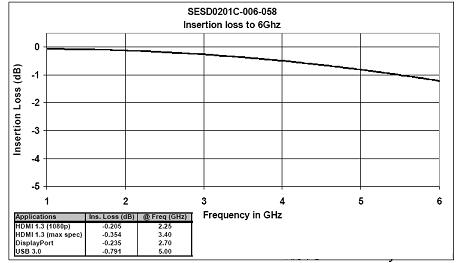 ESD 保护器件的电容与频率特性也可能影响高速端口的设计性能,从而增加设计约束。在高速系统中,针对某特定电容而设计的电路可能因采用的ESD保护方法不同而表现不同,这就迫使设计人员在构思HDMI电路保护机制时不得不使用复杂的软件过程改进与能力测定(SPICE)模型和仿真手段。图3,图4展示了泰科电子两种用于高速数据传输接口保护E的SD器件在高频传输速率下的插入损耗。