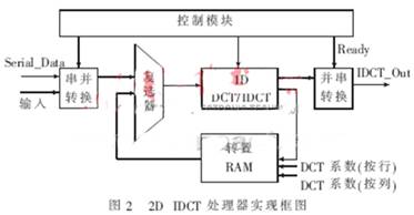 逆向离散余弦变换IDCT(Inverse Discrete Cosine Transform)电路的总体实现框图和其中的2D IDCT框图如图2所示。DCT系数经过反量化和反扫描电路处理后输入到IDCT的缓存器,由全局控制电路控制输入到2D IDCT单元及将最终变换好的数据送到输出缓存器中,发送Ready信号到运动补偿单元,通知该单元可以读出IDCT数据。2D IDCT单元进行2次1D IDCT运算,首先进行基于行的1D IDCT,然后将第1次IDCT的中间结果经转置存储器进行转置处理和缓存,再进行基于列的1D IDCT变换,得到最终的IDCT变换结果[3]。