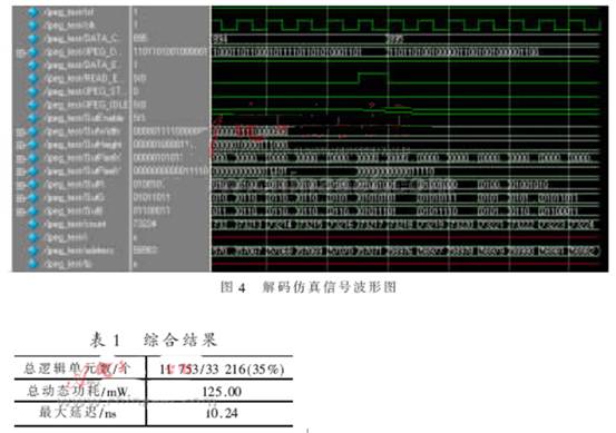 本文选用1幅1 920×1 080大小的JPEG图像,Modelsim进行RTL级仿真后的波形如图4所示。图中JPEG_DATA是码流数据,OutR、OutG、OutB是解码仿真结果[4]。在100 MHz的频率下对解码核心模块进行综合[5],结果如表1所示。