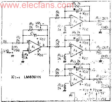 信号分配的办法,可以在低输出阻抗放大器的输出端加几个匹配用的75欧电阻或象本电路那样,每路各加一个宽事缓冲放大器。