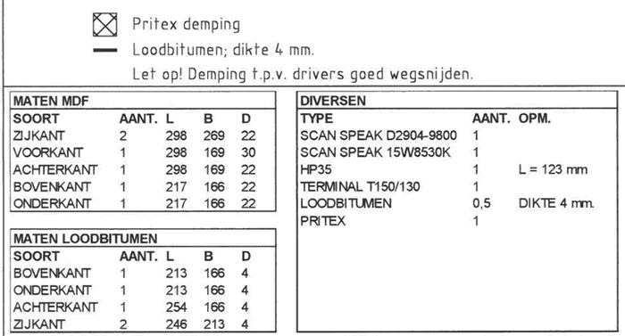 为了避免箱体共振,对两侧箱板和上、下面板使用22mm厚的中密度纤维板(MDF),前面板则使用30mm厚的MDF。6块箱板的内表面最好全部贴上4mm厚的铅皮(但较贵),也可贴上相同厚度的沥青油毛毡进行声阻尼。在箱板开口处应仔细地将阻尼材料剪掉,以免妨碍驱动单元和出声管的安装。