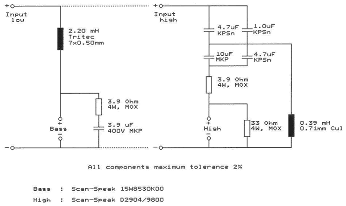 如果允许低音范围的声压级低于100dB,则可使用一只口径较小的低音单元。在这样低的声压级下通常难以使低频响应下潜到50Hz以下,但本音箱使用的Scan-Speakl5cm低/中音单元在低频下却能产生足够的声输出并能令人满意地重放2kHz-3kHz的声音,这样就不必使用中音单元了。某些口径较小的低音单元设计成能在较小的音箱中令人非常满意的重放低音,本音箱使用的低/中音单元就是一个很好的例证。