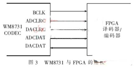 各芯片之间的互联通过引线连接到FPGA的IO脚。Nios II处理器的内部总线通过定义引脚连到IO,这样需要连接到Avavon总线的芯片可通过IO脚连到总线上。图3所示为WM8731CODEC芯片与主芯片FPGA的连接。