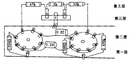 搭棚式接法一般将功放机内的各种元器件分为3—4层,安装元件的步骤是由下而上。接地线与灯丝走线一般置于靠近底板的最下层,其地线贴紧底板,并保持最好的接触;第二层多为各电子管阴极与栅极接地的元器件。注意同一管子阴极与栅极的相关元件接地最好就近在同一点接地;第三层是各放大级之间的耦合电容等元件;最上层则为以高压架空接法连接的阻容等元件。高压元件置于上层可以有效地防止高压电场对各级电路造成的干扰。