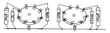 高压去耦电阻及电容必须靠近屏极电阻焊接,而电解电容的通地端与电源变压器高压接地端如相距较远时,还应加接优质通地线,以防止滤波电容器内的交流成分影响前级的电压放大管。图8—7是高压元件架空接法示意图。
