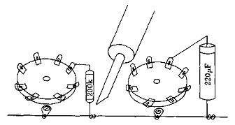元件焊上支架前应先将元件引线在支架绕牢,或穿进孔内勾牢,然后再进行焊接。对于元件,在焊接前必须将引脚表面氧化层用砂皮擦清,并镀好焊锡后再焊接。图8—4是管座与支架焊接示意图。