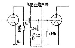 高频补偿电路与低频补偿电路原则相同,其阶梯补偿网络应接入前级放大器中。如将该补偿网络接到末级中,则它的频率响应开始下降的频率移到音频范围之外,否则会减小高频的最大输出。