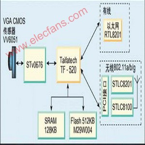 芯片IP 服务器,它只需存储器及以太网PHY,而像PCI 接口、MAC 以及用于TCP/IP 协议栈处理的特殊IP 等其他部分都已集成。如果设计成无线方式,则只需将一块miniPCI WLAN 卡与系统相连,并改变固件即可获得一种无线解决方案。