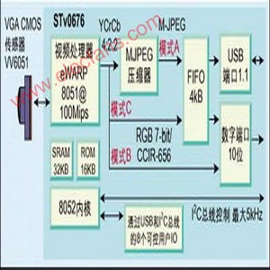 图3模式A STv0676 采用USB 模式,通过FIFO(先先进先出)直接将图像数据传送至USB