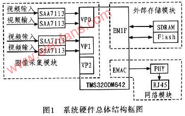 系统整体硬件设计基于TMS320DM642 EVM板TMS320DM642 Ver5.1,图像信号由扩展的多路CCD图像传感器提供,模拟信号经图像解码器SAA7113将其解码成数字并行ITU-R BT.656码流,并传送至TMS320DM642的视频接口。TMS320DM642视频口VP0、VP2接收到视频数据流,采集每帧图像后,图像数据通过EDMA方式转移到外部存储器,这时TMS320DM642处理器可根据应用程序的需要读取数据并执行相应的运算处理程序,然后通过EMAC网络模块进行网络传输。其总体构成框图如图1所示。
