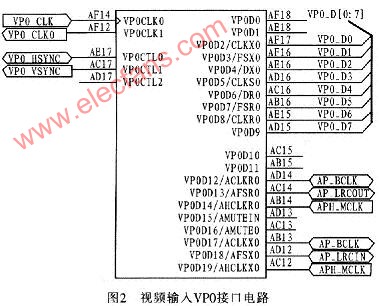系统视频模块主要由4路CCD图像传感器、TMS32013M642的视频端口、图像采集器件等组成。TMS32019M642集成有3个视频端口VP0、VPl和VP2,每个VP(Video Port)口分为A、B 2个通道,每个通道都可分配为视频输入/视频输出口,但A、B 2个通道只能同时被配置成输入或输出口。TMS320DM642的VPO中的VPO/A、VPO/B和VPl中的VPl/A和VPl/B配置成接收8位ITU-R BT.656码流格式,分别挂接SAA7113H。以VPO口为例,图2为图像输入接口电路原理图。