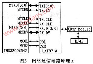 从TMS320DM642传输来的数据由LXT971转换为以太网物理层接收的数据,通过双绞线连接XFmr Module隔离变压器和RI-45头连接到网络传输至上位机,如图3所示。