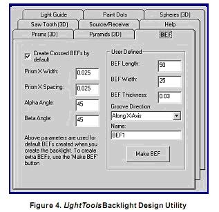 LightTools软件提供背光设计工具实现导光板的设计。此工具(图4)协助用户创建背光的各种组件。其他选项包括向模型添加光源/反射器组件,BEF建模,建立一个接收器来分析亮度。背光工具的界面是多个标签,用来设置和修改各种不同类型的光线提取机制。