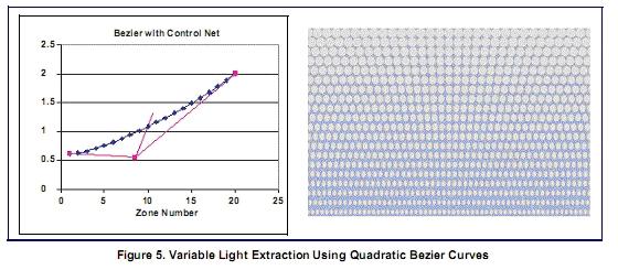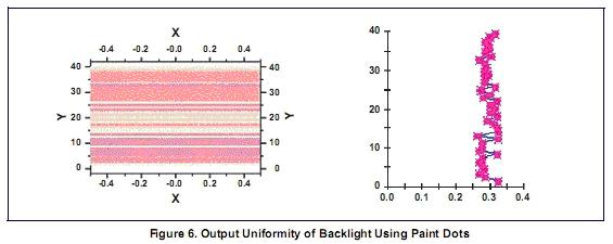 对于使用网点印刷光线提取方法的背光,背光工具可以设置印刷点的大小尺寸和长宽比的线性变化, 以及网点间距沿着导光板长度方向的线性变化。这种线性变化的结构对显示均匀性往往是一个良好的起点,但并不足以满足最终的均匀性要求。进一步控制均匀性可以使用非线性变化的光线提取参数。一种使用最少参数而且控制非常灵活的方法是定义二次贝塞尔曲线的参数变量。 LightTools软件的二维区域工具可用来设置非线性结构。图5显示了一个使用印刷提取的例子,其中3个参数(印刷点宽度,高度和垂直间距)的变化来获得不同的提取行为。输出均匀性如图6所示。其中右图显示平均输出亮度是一个常数。