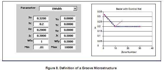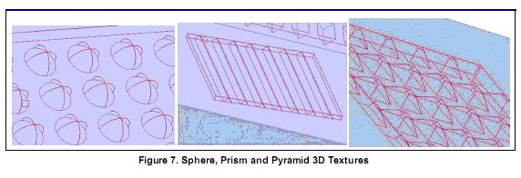第二种提取方法,模压成型提取技术,使用了LightTools软件的三维纹理功能,这使得对重复结构的光线追迹非常有效,存储信息非常紧凑。非三维纹理功能创建的模型,其光线追迹比用三维纹理创建的模型要慢30多倍,文件要大100多倍。三维纹理有三种基本形状可供选择:球形,棱形,和金字塔形(图7)。背光工具可以定义线性可变的微结构。但是三维纹理工具可以使用二次贝塞尔曲线非线性地改变纹理参数。图8所示的例子是一个槽形微结构(使用棱形3D纹理建模)作为提取机理。由此产生的导光板,及其仿真结果如图9所示。