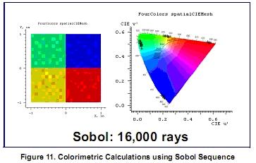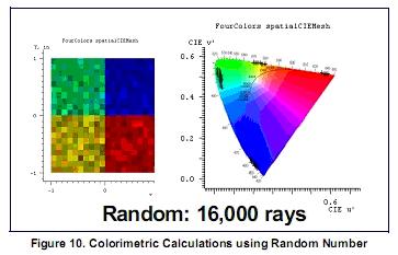 蒙特卡罗仿真是LightTools软件计算照度的基础。随机数生成器用来选择光线开始位置,方向和波长,用于取样在接收面的光线分布。“随机”数字的选择会大大影响仿真的收敛。使用低差异(Sobol)数字序列(它不是完全随机的),可以将错误减少到1/N,其中N是光线在接收端的数量。可以看到采用随机数字序列(图10)和Sobol数字序列(图11)计算色度的比较结果。在这个例子中,采用随机128,000条光线的仿真结果相当于Sobol的16,000条光线的准确性。重要的是比较不同软件的仿真收敛速度,我们关心的是达到某种仿真精度的速度,而不是追迹一定数量光线的速度。在LightTools软件中,接收器是用来收集光线数据计算照度的。