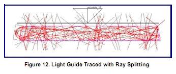 背光分析的一个重要方面是导光板表面的分光和散射。导光板的作用是光线能在内表面多次反射后被吸收或射出。如果光线在每个接触面都分光成透射和反射两部分,将造成非常大数量的分光光线,其中大多数并不携带多少能量,从而减慢了分析速度。这方面的一个例子如图12所示,显示了一条开始光线,由于分光造成的很多路径。