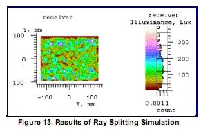如图16显示了相同的例子,但是按重要值采样,在扩散板上指定了目标角度。目标角度匹配亮度计光圈的接受角度。当光线到达扩散板,LightTools软件将产生散射光(基于扩散模型的角分布推算的进入目标区域的光通量)进入目标角度,使亮度计收集的所有散射的光,从而改善了仿真的收敛。在这种情况下,2000条入射光线,1416条光线(71%)被亮度计接收。