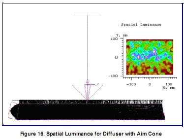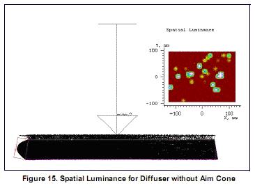 最后,为了改善显示的均匀性,有时在导光板顶面使用扩散板。由于扩散板将光扩散到更广的角度上,散射到亮度计光圈的光就少了,而按照常规显示器亮度测试方法,需要非常大的光线数量作亮度计算。LightTools软件将目标区域或角度与散射表面对应,使用户可以指定哪些散射应该考虑。这是一个重要的采样形式,也是改进蒙特卡洛模拟收敛性的另外一种方法。 图15显示了一个亮度计,和带有扩散板的背光,没有指定目标角度。追迹2000条光线,亮度计接收到40条光线,空间亮度的光栅如图所示。