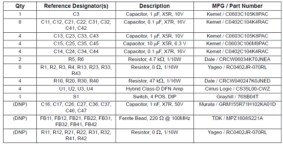 Contains 4 CS35L00 Hybrid Class-D Amplifiers