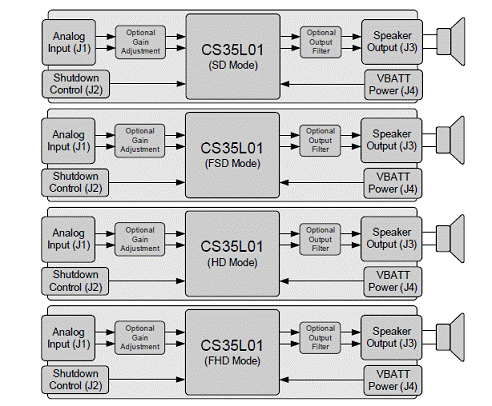The -SD, -FSD, -HD, or -FHD suffix designates the CS35L01’s operational mode. Each of the four boards is configured to operate in each of the four corresponding modes of the CS35L01 device.