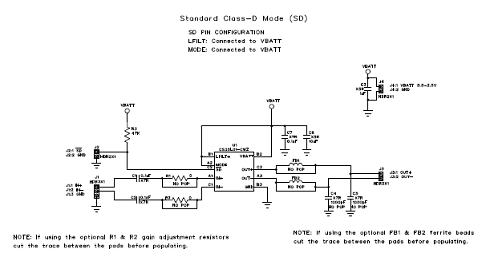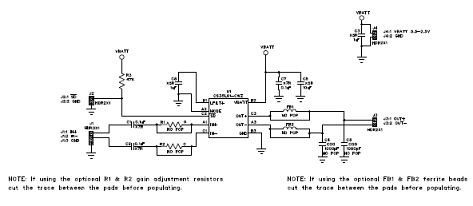 Differential audio inputs can easily be connected through the J1 header. If desired, the gain can be adjusted through the optional input resistors.