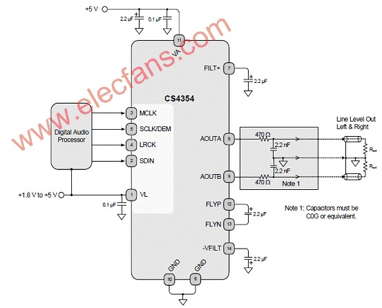 The CS4354 is a complete stereo digital-to-analog system including digital interpolation, third-order multi-bit delta-sigma digital-to-analog conversion, digital de-emphasis, analog filtering, and on-chip 2 VRMS line-level driver from a 5 V supply.