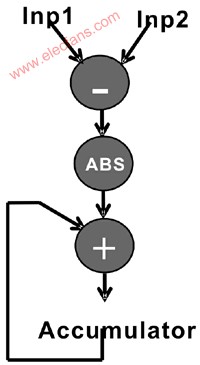 SAD核心算法的基本计算方法如图2所示。正像图中所示的那样,SAD核心算法首先执行减法操作,然后取绝对值,最后对前面的结果进行累加。