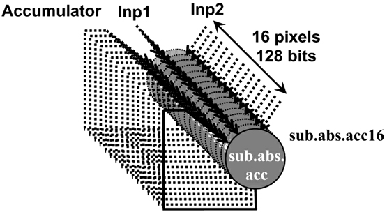 前面的SAD程序还可以进一步优化。程序中的内循环将宏块中16列做相同的运算。这对于SIMD(单指令多数据)功能部件而言是理想选择,相应的指令“sub.abs.ac16”针对16个像素同时完成sub.abs.ac操作,如图5所示。