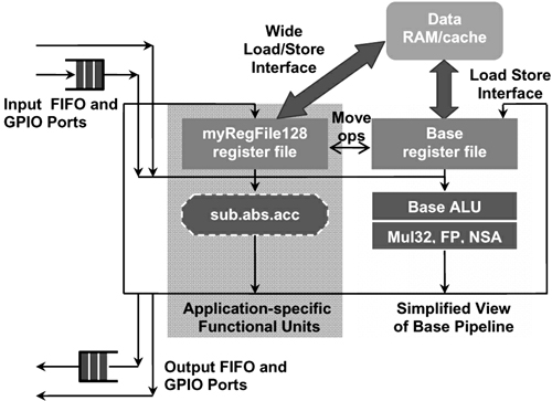 为了对高带宽定制寄存器文件(以及相应的单指令流多数据流SIMD功能部件)进行数据存取,处理器应当具有高带宽数据加载/存储操作能力。对可配置处理器而言,设计人员能够说明定制加载和存储操作指令,直接完成对定制寄存器文件的高带宽加载/存储数据操作。然后,编译器自动产生与高带宽加载/存储接口相应的加载/存储指令。