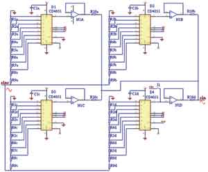其次是高精度的正弦波基准信号的程控,最简单方法是使用微处理器进行12通道的A/D转换,用这12通道去控制CD4051的输入端A、B、C(INH=0时),即产生212=4096个状态。如图6所示,开关D1~D3控制模拟量低位,D4控制高位。通过合理计算R1a~R9d,0~4096个状态对应0~5V程控直流电平输入。需要注意的是,第4096状态产生的条件是12通道都为0时而第4个CD4051的INH=1时,它输出正弦波模拟量最大值。