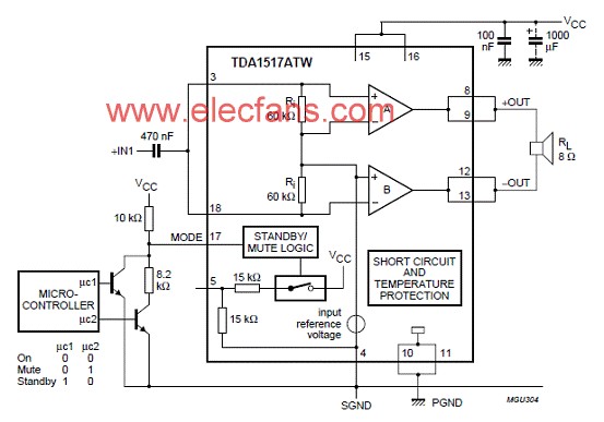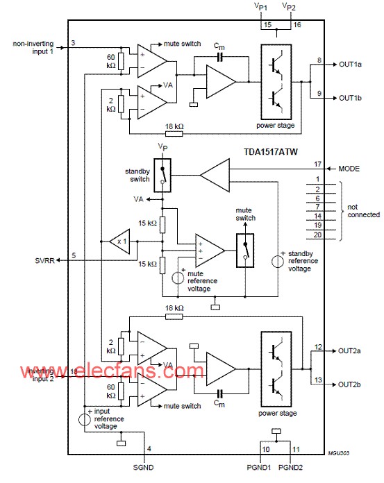 DC短路安全。本文介绍了TDA1517ATW主要特性,方框图以及BTL和SE连接应用框图。