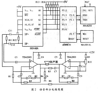RS?232电平信号转换成TTL电平并送到单片机AT89C51,AT89C51根据PLC的指令,通过P3.6控制ISD1420的放音,P3.2~P3.5用来调整放音地址。MAX813L则作为看门狗为单片机AT89C51提供上电复位和运行监控,由P3.7提供喂狗信号。