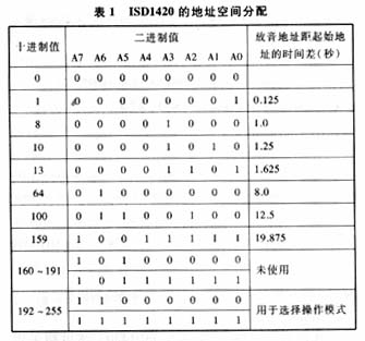 地址引脚(A0~A7)有两个作用,取决于A7、A6的状态。当A7或A6有一个为“0”时,A0~A7解释为地址位,作为当前录放操作的起始地址。我们设计的电路使用了A0~A7的地址位功能。ISD1420的地址空间分配见表1。?