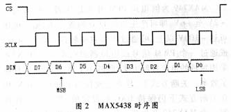 单片机的3个I/O引脚与MAX5438的3个控制信号相连。