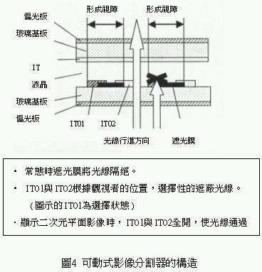 日本SANYO公司是最早从事有关三维立体影像技术的研究,早在94年曾推出不需专用眼镜的三维立体影像分割器,利用这种影像分割器可用来观赏立体动态影像,基本上它是根据视差障碍(parallax barrier)原理使影像交互排列先通过细长的纵列光栅后才由两眼捕捉观察,由于进入左、右眼的纵向影像因视差障碍器被分开,造成左、右眼所捕捉的影像产生微小偏离,最后经由视网膜当作三维影像读取(图1)。