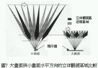 传统的不需专用眼镜的三维立体影像显示器,同样水平方向时小画面的前后方向的立体可视范围比大画面的立体可视范围大(图7),这是因为小画面的视角比较小,液晶显示器与影像分割器较不容易产生所谓的moire干涉缟。利用这种物理现象将液晶显示器与影像分割器,藉由电子方式分割成16等份各别掌控专属区域(图8)