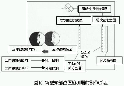 换言之它可针对观视者的位置将上述影像分割器的开口部位置,以及液晶显示器内的影像微调到最适当状态,如此无论立体观视远、近,观视者都可以观赏到三次元立体影像。根据液晶显示器上方的立体头部检测系统(stereo head track)所侦测有关的观视者二次元位置数据(前后左右),同时控制并切换液晶显示器左、右眼影像,以及影像分割器的开口部位置,对立体观视区以外的观视者则进行上述个别影像分割控制(图9)、(图10),其结果如图11所示前后方向的立体观视区比以往扩大三倍以上。