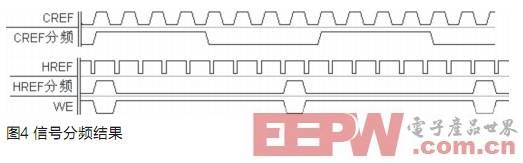 为了实现图像数字信号的分频处理,可以分为两种实现方式,其一是软件分频,另一种是硬件分频。对于软件分频来说,系统不需要额外的分频电路,而是单片机利用解码芯片SAA7111输出的控制信号,对读时钟进行分频后再执行实际的读操作,这种方式的缺点是分频工作需要占用单片机资源,影响系统的实时性等性能;对于硬件分频来说,需要加入专门的分频处理电路,在不需要单片机控制的条件下实现图像的压缩,从而在根本上减少了单片机处理的数据量并缩短读取图像的时间。因此该系统采用了硬件分频的方式,具体信号的分频模式如图4所示,CREF代表像素时钟,分频后得到的是AL422B的写时钟WCK,HREF代表行参考信号,分频后得到的信号作为AL422B的写允许信号。