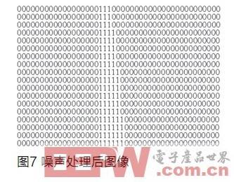 (3)按照步骤(2)逐步往上一行递推,如果遇到全0的行则停止黑线的搜索。图6所示的图像经过该算法处理后得到的图像如图7所示,可见此方法能够有效地消除图像的噪声。