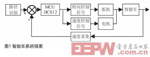 智能小车系统主要由路径识别、速度采集、转向控制及车速控制等功能模块组成。路径识别功能采用CMOS摄像头,将其模拟量的视频信号进行视频解码后,经过二值化处理并转化为18×90pix的图像数据后送入MCU进行处理;转向控制采用基于模糊控制算法进行调节;而车速控制采用的是经典PID算法,通过对赛道不同形状的判断结果,设定不同的给定速度。该系统以50Hz的频率通过不断地采集实时路况信息和速度,实现对整个系统的闭环控制,如图1所示。