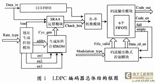 由前文的分析可知,LDPC编码器不仅需要同时支持三种码率的编码,而且为了实现与符号映射方式的最佳配合,编码后的输出码流必须支持1,2,4,5,6位可控。在此采用图1的硬件实现方案,整个编码器可分为7个模块。