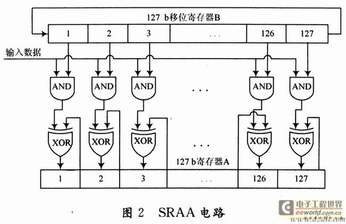 (1)运算模块。负责校验位的计算。式(1)中的每个Gi,j矩阵都是127×127的方阵,所以可将输入的信息序列分为长度为127的k个小段,编码就可以分解为k个子过程。编码核心部分采用文献[7]提出的串行输入/并行输出的SRAA电路,如图2所示。其中B存储Gi,j的生成多项式(矩阵第一行),A用来存储运算的中间结果。由于式(1)中的Gi,j是循环方阵,它的每一行都是上一行的向右移移位,而第一行是最后一行向右移一位;每一列都是左一列向下移一位,而第一列是最后一列向下移一位,所以在每126个时钟内B中数据每隔一个时钟进行一次循环右移,126个时钟后,读入下一个Gi,j的生成多项式。如此循环计算,即可得到所有的校验位。单独考虑DTMB标准中0.4,0.6,0.8三种码率的的编码,分别需要35,23,11个SRAA电路并行才能完成所有的校验位获取。因而为了实现三种码率编码器资源的复用,并且综合考虑运算速度,在此采用35个SRAA电路并行的方案。