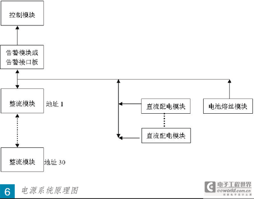 系统的工作原理是整流模块把交流输入变成直流输出,然后送到由汇流排并联的直流配电模块和电池熔丝模块,经配电模块内部分路开关或熔丝输出,向负载供电,同时亦对电池充电。当市电中断时,由电池向负载供电。控制模块通过RS485与告警模块及整流模块通讯。而数据测量、采集则由告警模块负责,其对象包括市电、直流配电模块、电池熔丝模块和电池等。系统工作时,控制模块监视系统的各种状态,调整其参数,自动执行预定的各项任务,系统异常时发出告警信号,经由告警模块输出并显示在控制模块上。