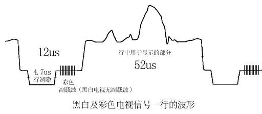 最好彩色电视信号能够与黑白电视信号保持兼容,以便彩色电视信号在黑白电视机上能播放出黑白的图像。这个问题是很困难的,因为色度信号也要占用较大的带宽,而在电视射频频带上,一个频道挨着一个频道,亮度信号(实际上还有调频的伴音信号)已经把频带给塞满了,幸运的是,后来终于运用压缩亮度信号带宽、大面积着色等技术解决了这个问题。从频域的角度来看,色度信号(UV色差信号)是插在亮度信号的频谱的间隙之中的,具体的位置是插在4.43MHz的地方,带宽1.3MHz。在接收机中,简单地说,把收到的信号中的4.43MHz处的带宽1.3MHz的信号取出来就成了色度信号,而把收到的信号中的4.43MHz处的这个信号滤掉剩下的就是亮度信号。很多硬件工程师可能不容易理解这是什么意思,不过没关系。下面我们从时域的角度来看看它们的一行的波形,如图所示,黑白视频的亮度信号采用了调幅制,一行的周期是64μs,其中显示在屏幕上的信号占52μs,其余部分为行消隐、行同步头。对于彩色信号,还在行同步头上叠加了一小段4.43MHz的副载波信号,用作接收机中的4.43MHz信号的频率和相位基准。