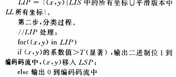 对某个阈值T进行显著性测试。将大于T的元素移入LSP,并在LIP队列中移除该元素。对LIS也进行同样的测试,将显著的元素移入LSP,其他的再进行树的分裂。