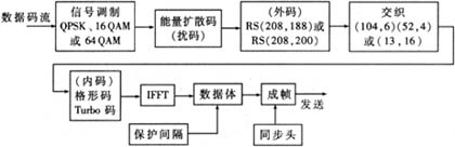 在调制和编码过程中提供了若干种可选的模式,如外码选用高数据率的RS208?200或高保护率的RS208?188等。这主要是为了对不同的数据提供不同的优先级和保护级别,达到分层传输的目的。