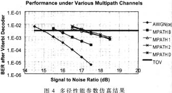 DMB-T系统中是在时域插入序列,利用信道的冲击响应来进行信道估计,对数据传输率的影响为7%。高斯噪声和时变信道对本信道估计算法的影响并不大,而且由于在开发设计过程中对算法进行了较多的优化与改进,所以本系统在抗多径干扰方面具有突出的性能,对移动接收环境尤其适用。对系统参数的仿真结果如图4所示。